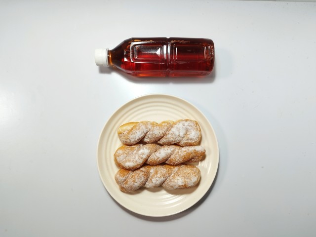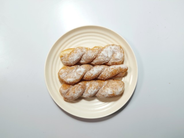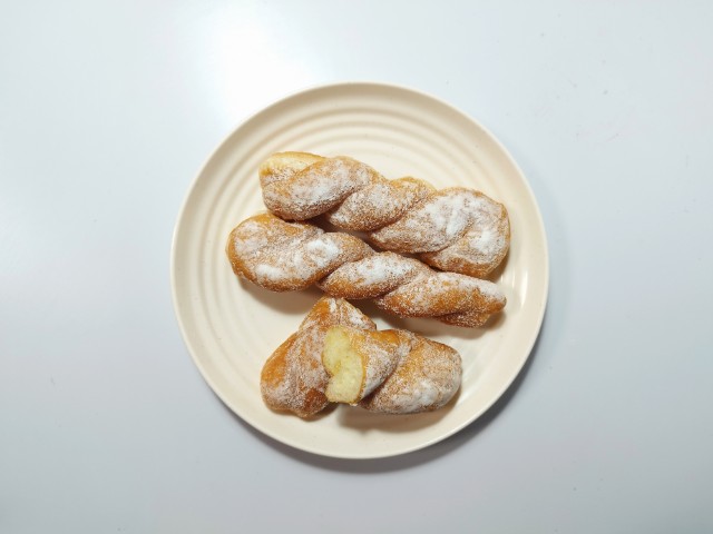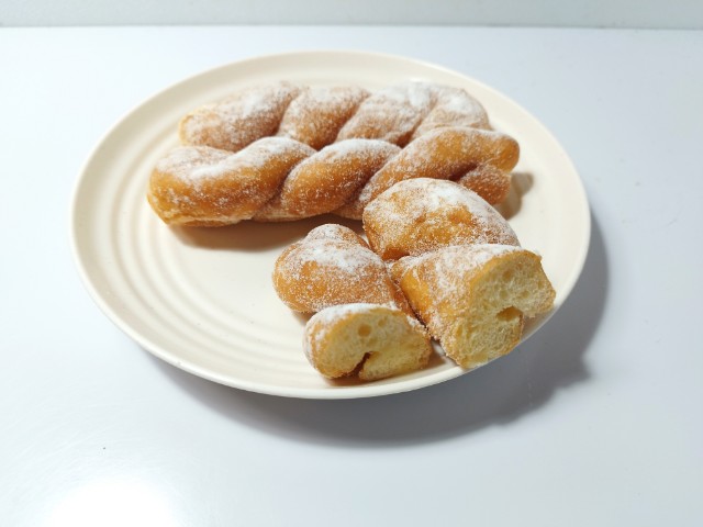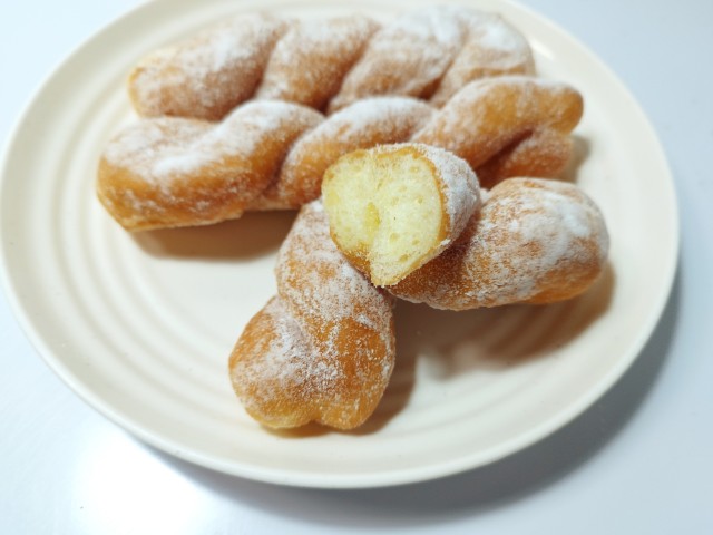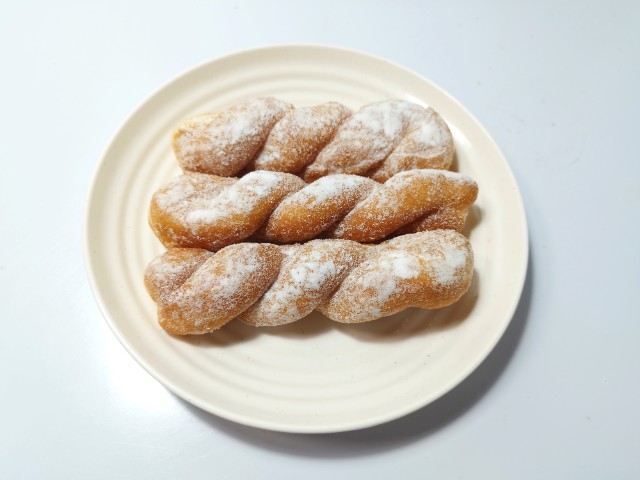 ツイストドーナツです。以前の購入が2025年4月1日発売だったので、約9ヶ月以上経っていますが、価格は変わっていません。そんなツイストドーナツですが、生地はしっとりとした食感と歯切れの良さがあって、美味しいのひと言です。ツイスト状になっている事で、粉糖のかかり具合も変わっていて、食べ進めるごとに甘味の違いを楽しめます。3個入で、1個がそこまで大きくはないので、一人でも食べ切れなくはないですが、シェアするのにピッタリだと思います。ぜひツイストドーナツを食べてみてください。
