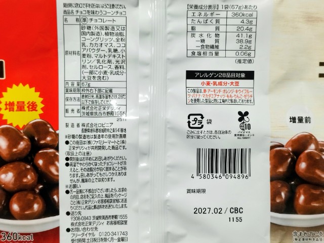 以前に購入した商品は2022年8月2日発売で商品名が【40%増量作戦】チョコを味わうコーンチョコでした↓