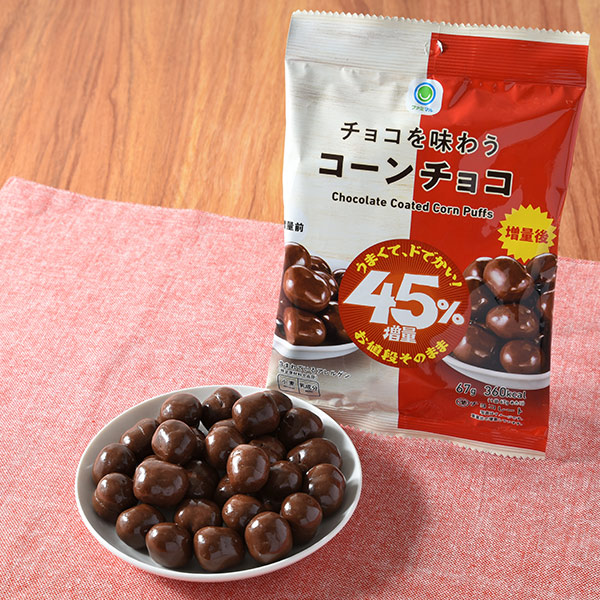 サクッと軽い食感のコーンパフにくちどけのよいチョコレートをコーティングしたコーンチョコを“なぜか45%”増量しました。[数量限定]※商品無くなり次第終了となります。※地域・店舗によって取り扱いのない場合や価格が異なる場合がございます。※各店舗で販売数量は異なります。