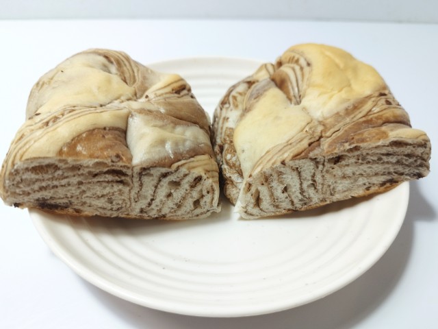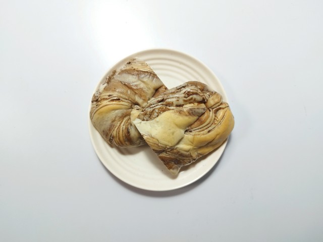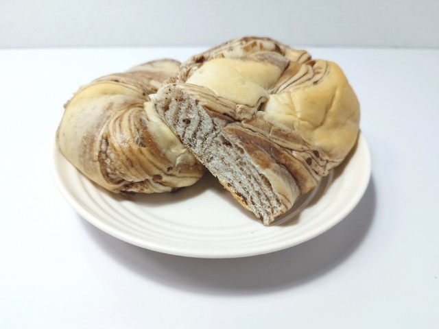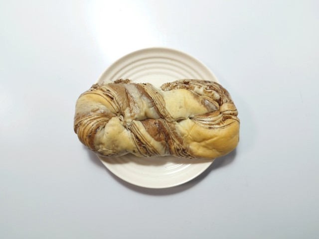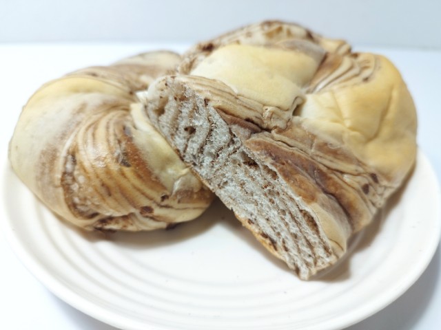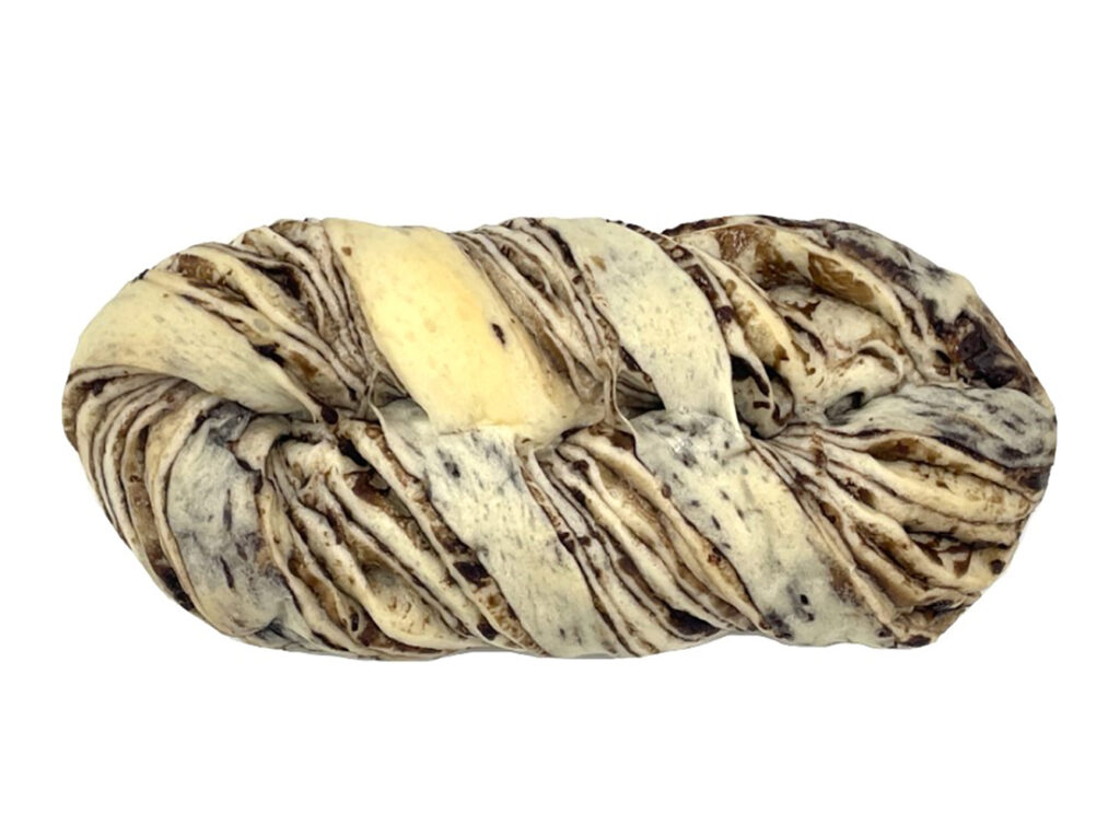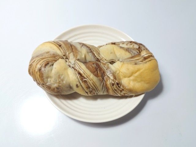 もちもちとした食感が特長のパン生地をねじり、マーブル模様にしたチョコレート風味の菓子パンです。