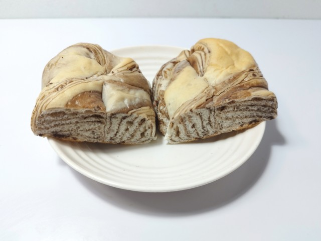 もちもち生地の菓子パンです。以前の購入が2025年9月9日発売だったので、約半年近く経っていますが、価格は変わっていません。そんなもちもち食感チョコブレッドですが、生地はもちもちとした食感と歯切れの良さで、ハマってしまう美味しさです。生地にはチョコレートフラワーペーストが折り込まれていて、チョコの甘みと風味を楽しめて、もちもち生地とのバランスも良いです。菓子パンではありますが、くちどけが良くて甘過ぎないので、甘いのがちょっと苦手な方にも食べやすいと思います。大きさは普通の菓子パンサイズくらいで、おやつや小腹が空いた時にピッタリです。ぜひもちもち食感チョコブレッドを食べてみてください。