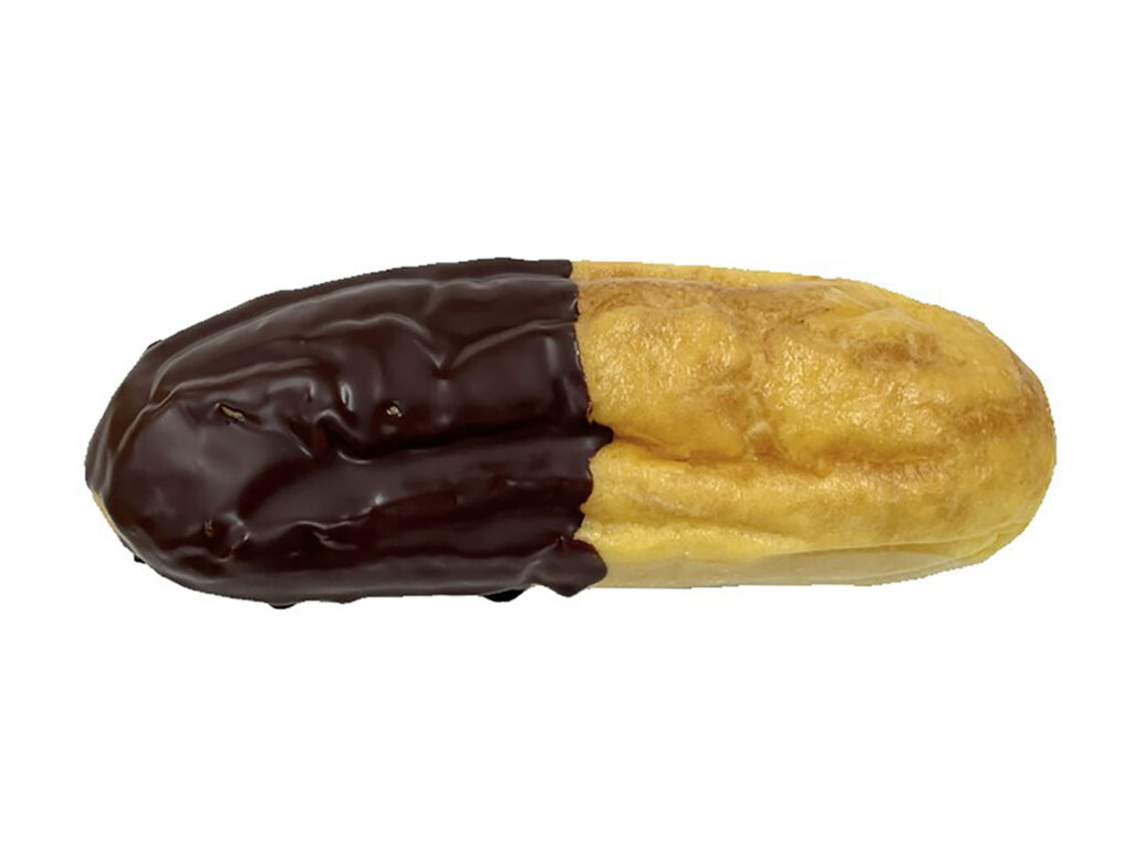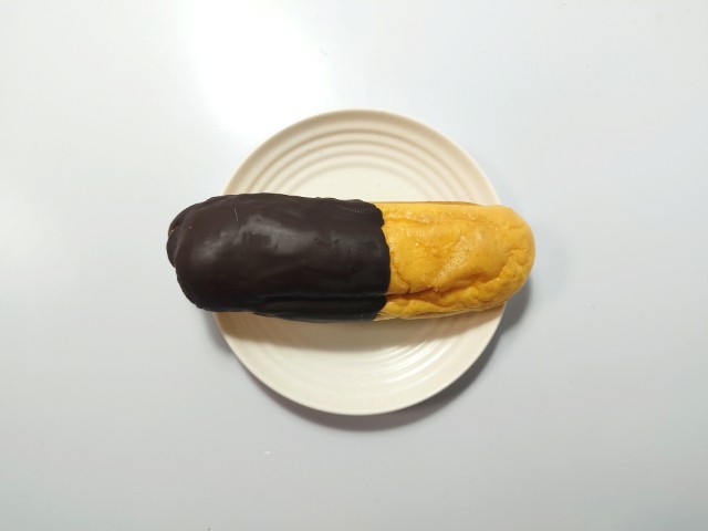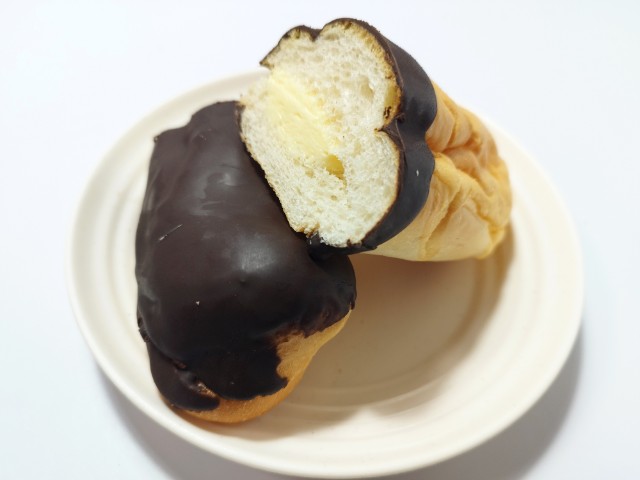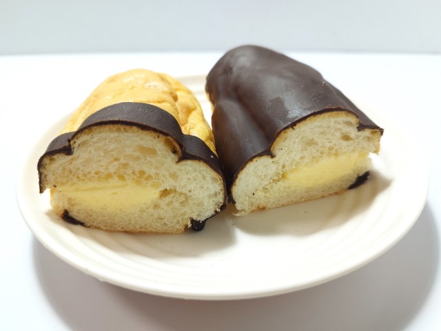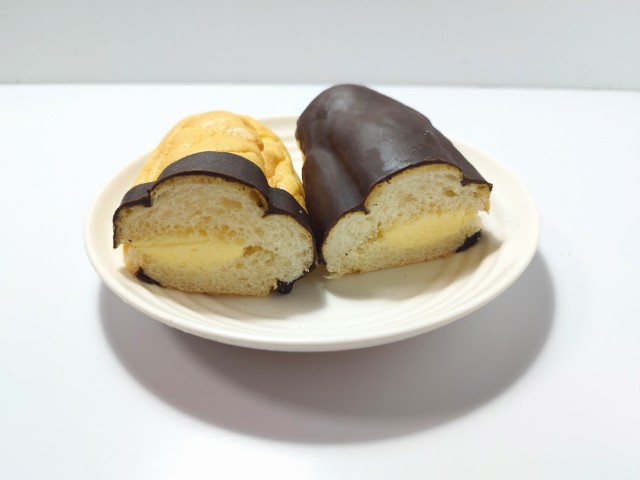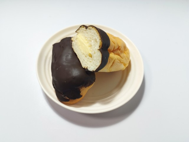 シュー生地を絞り、ふんわりしっとりと焼き上げたパン生地に、カスタードクリームをサンドしました。チョコレートを半掛けすることで、2種類の味を楽しめる菓子パンです。