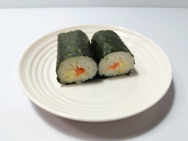 サーモンわさびマヨネーズを使った手巻寿司です。以前の購入が2025年9月2日発売だったので、約5ヶ月近く経っていますが、価格が230円(税込248.40円)から258円(税込278.64円)へと変わっています。そんな手巻寿司ですが、サーモンサーモンの旨味とろけるような味わいで、美味しいのひと言です。玉ねぎ入りのわさびマヨネーズわさびの風味マヨネーズの酸味たまねぎの食感で、サーモンの美味しさをさらに引き立てています。ほどよい酸味の酢飯パリっとした海苔ともバランスが良く、最後のひと口まで飽きることなく食べられます。大きさは普通の手巻寿司サイズで、小腹が空いた時軽く食事を済ませたい時にオススメです。ぜひサーモンわさびマヨネーズ巻を食べてみてください。
