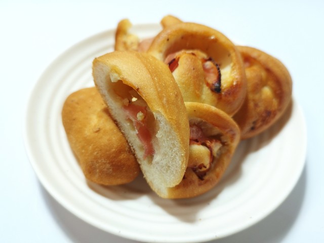 歯切れの良いフランスパンにスライスベーコンと、ブラックペッパーを入れたマヨドレッシングを包み、焼き上げた惣菜パンです。