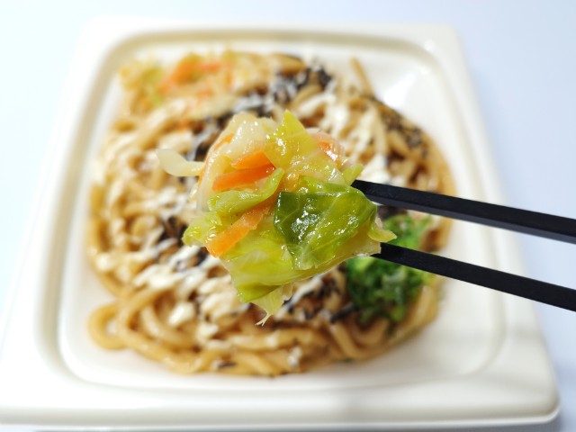 明太子とマヨネーズを使った焼うどんです。以前の購入が2025年2月4日発売だったので、1年以上経っていますが、価格が508円(税込548円)から510円(税込550円)に商品名が【関東・東海・関西】大盛 明太マヨ焼うどんから大盛 明太マヨ焼うどんへと変わっています。そんな焼うどんですが、だしの旨味と醤油の風味、あっさりとした後味で、箸がどんどん進みます。また、トッピングのマヨソースが味のアクセントに、明太ソースが味変となっている事で、味が単調にならず、最後のひと口まで飽きることなく食べられます。具材にはキャベツや青ねぎ、人参、玉ねぎなどがのっていて、それぞれの味や食感を楽しめます。今回は見た目もあって撮影ではしてませんが、しっかりと全体を混ぜ合わせて食べるのが、一番美味しい食べ方だと思います。内容量は商品名通りの大盛なので、ガッツリ食べたい方にはちょうど良いと思います。ぜひ明太マヨ焼うどんを食べてみてください。
