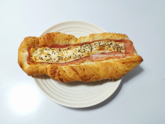 チーズパウダーをトッピングしたデニッシュ生地に1枚ベーコン、チーズ入りクリームを絞り、アクセントにブラックペッパーをトッピングしました。
