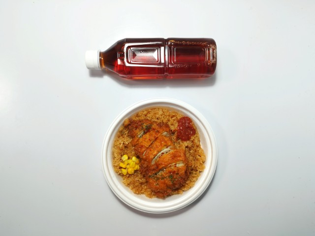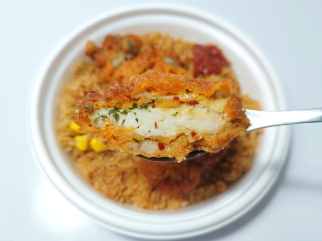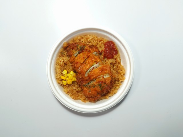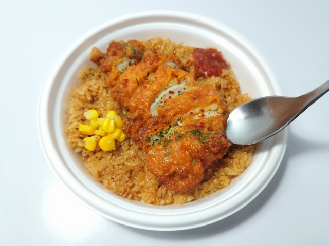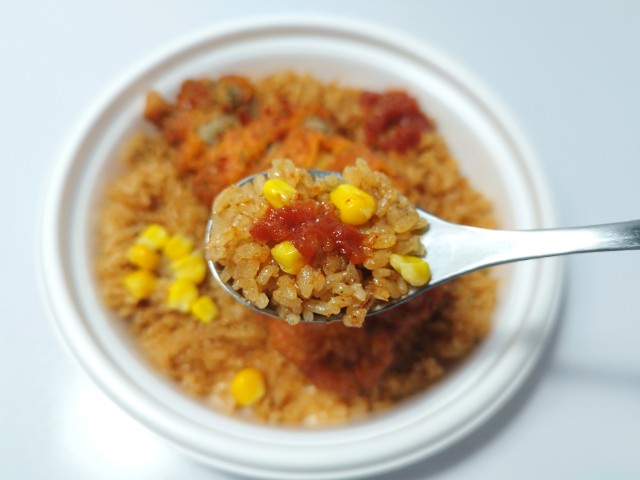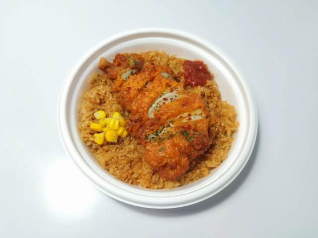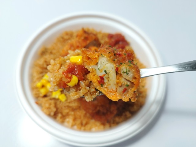 フライドチキンがのったジャンバラヤです。以前の購入が2025年9月16日発売だったので、半年以上経っていますが、価格は変わっていません。そんな辛旨チキン&ジャンバラヤですが、ジャンバラヤはスパイスの風味とほどよい辛味、トマトのほのかな酸味があって、食べ出すと止まらなくなる美味しさです。フライドチキンはジューシーな肉質とスパイスの辛味、にんにくの味わいで、ジャンバラヤともよく合います。ポイントはトッピングの辛口トマトソースで、ジャンバラヤやフライドチキンと合わせることで、辛味と酸味を自分なりにカスタマイズできます。内容量は1食分にちょうどよく、お腹も満たされます。ぜひ辛旨チキン&ジャンバラヤを食べてみてください。