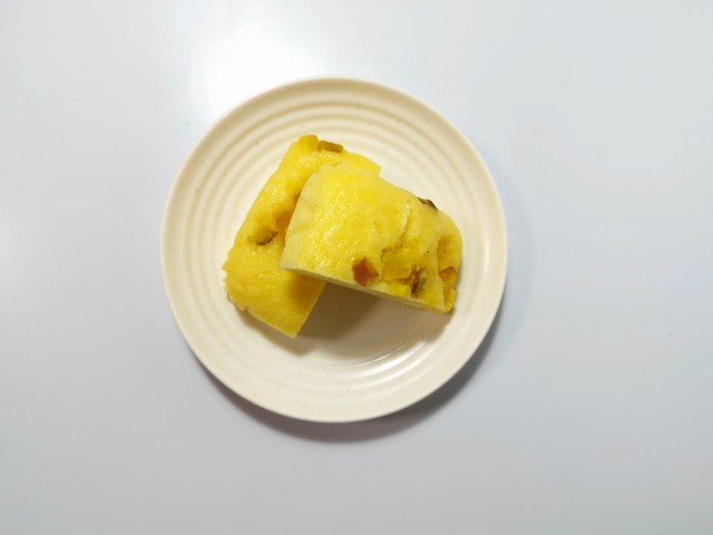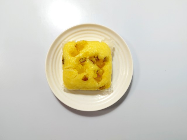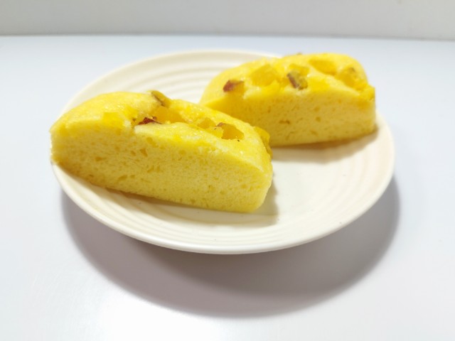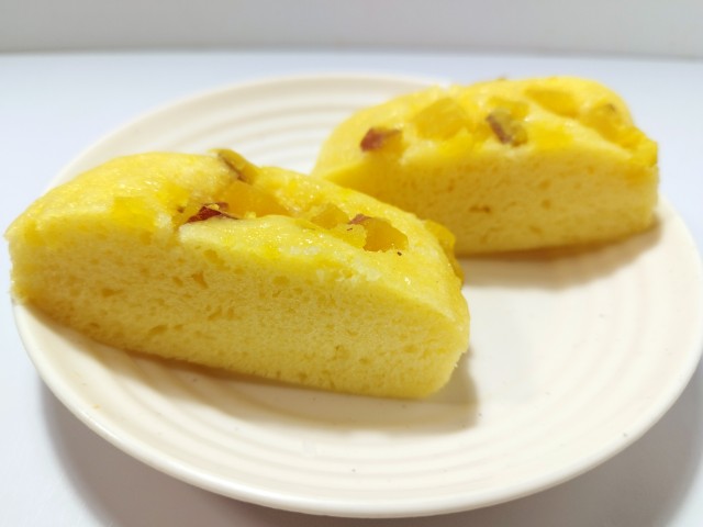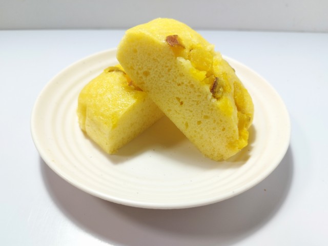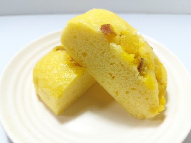 なると金時の糖漬けさつまいもの角切りを生地の上にのせて蒸し上げました。さつまいもの具材感が感じられるもっちり食感の蒸しぱんです。