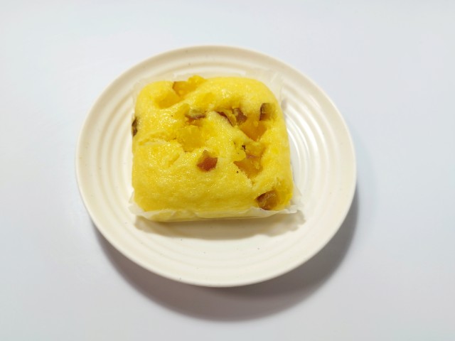 さつまいもの蒸しパンです。以前の購入が2024年9月10日発売なので約1年近く経っていますが、価格は変わっていません。ただ商品名が7P なると金時 さつまいもの蒸しぱん1個入から7P なると金時 さつまいも蒸しぱん 1個入に変わっています。そんなさつまいも蒸しぱんですが、生地はもっちりとした食感とたまごの風味、やさしい甘味があって、これだけでも美味しく食べ進められます。トッピングの鳴門金時のダイスはしっかりめの甘味とほくほくとした食感で、味や食感のアクセントになっています。甘過ぎない蒸しパンといった感じなので、甘いのがちょっと苦手な方にも食べやすいと思います。大きさは普通の菓子パンサイズで、おやつや小腹が空いた時にピッタリです。ぜひさつまいも蒸しぱんを食べてみて下さい。