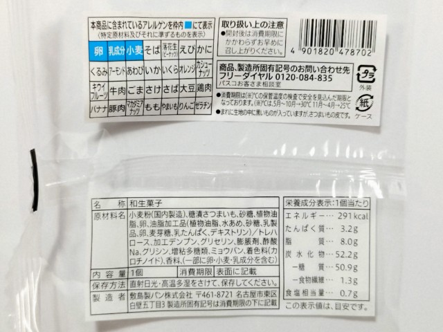 熱量:291kcal、たんぱく質:3.2g、脂質:8.0g、炭水化物:52.2g(糖質:50.9g、食物繊維:1.3g)、食塩相当量:0.7g