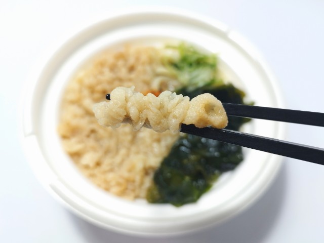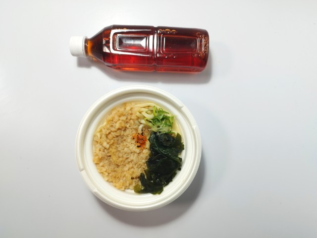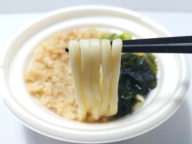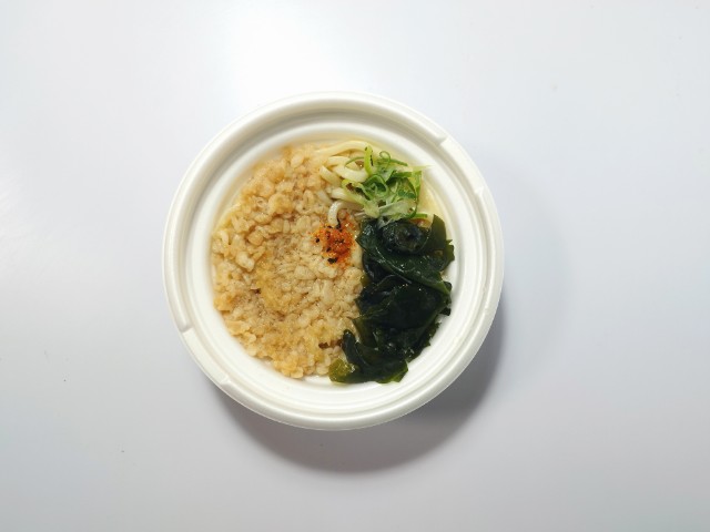 たぬきうどんです。以前の購入が2025年9月17日発売なので約1ヶ月近く経っていますが、価格は変わっていません。そんなたぬきうどんですが、つゆはだしの旨味と醤油の風味があって、うどんとのバランスも良いです。うどんは小麦の風味とのどごしの良さで、箸がどんどんと進みます。具材には揚げ玉やわかめ、ねぎがのっていて、それぞれの味や食感と楽しめます。特に揚げ玉は時間が経つにつれて、しっかりとつゆを吸って、さらに美味しさが増すのもポイントだと思います。内容量は1食分にちょうどよく、お腹も満たされます。ぜひたぬきうどんを食べてみて下さい。