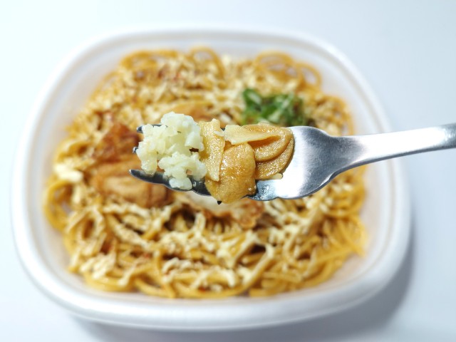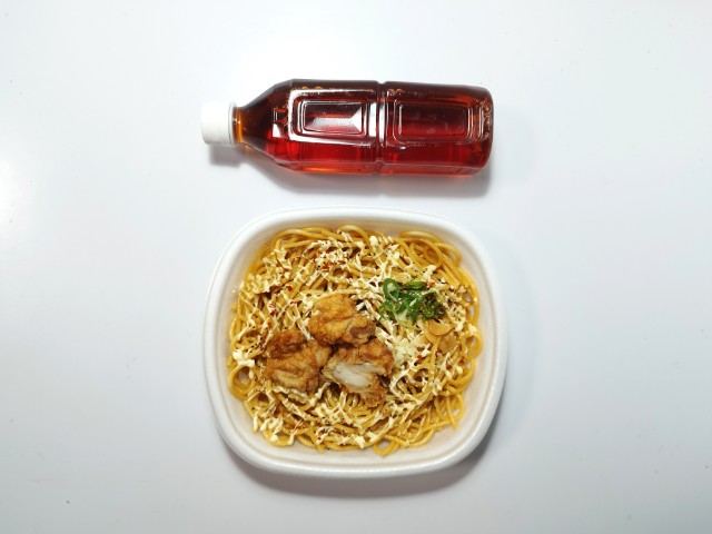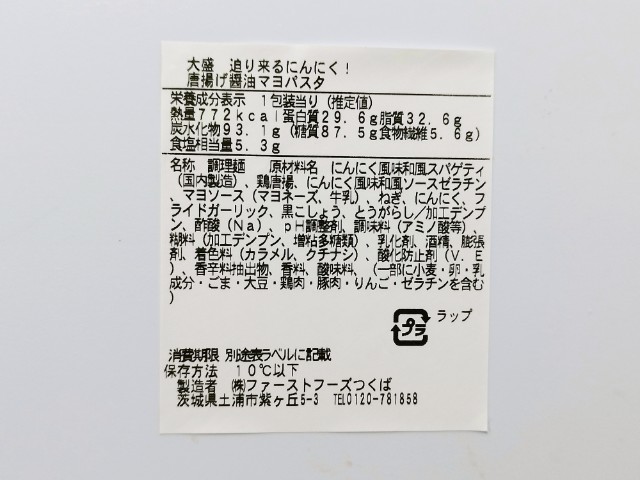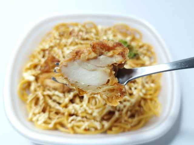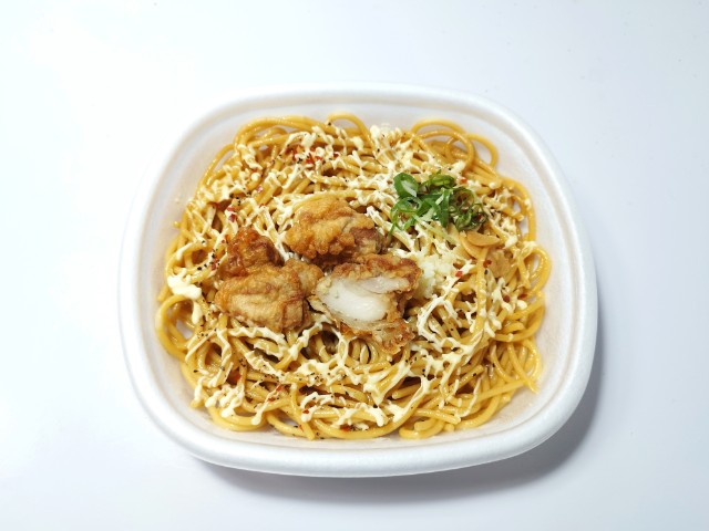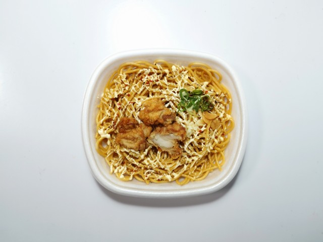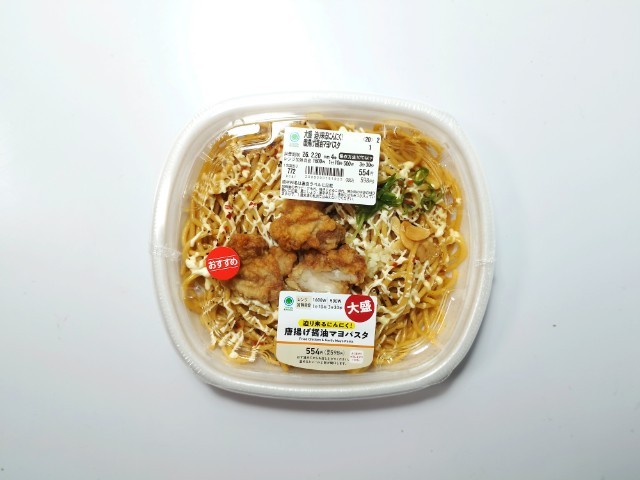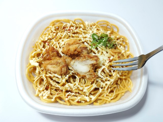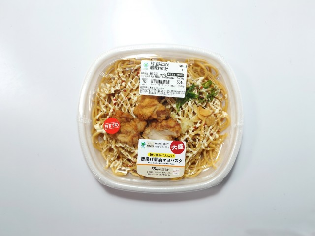 ファミリーマートの今週の新商品「大盛 迫り来るにんにく!唐揚げ醤油マヨパスタ」を食べてみました。