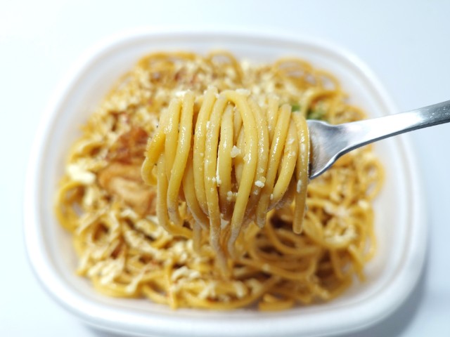 にんにくが効いた醤油マヨパスタです。以前の購入が2024年9月17日発売だったので、約5ヶ月以上経っていますが、価格が536円(税込578円)から554円(税込598円)に商品名が【背徳のコンビニ飯】大盛 から揚げとにんにく背脂醤油マヨパスタ2から大盛 迫り来るにんにく!唐揚げ醤油マヨパスタへと変わっています。そんな唐揚げ醤油マヨパスタですが、ガラの旨味醤油の風味にんにくの味わいがあって、ハマってしまう美味しさです。特ににんにくかなり強烈で、ひと口食べると感覚がマヒするくらいににんにくの香りが口の中で広がります。パスタほどよい硬さ小麦の風味で、食べ応えがしっかりとあります。トッピングには唐揚げを始め、にんにくチップみじん切りにんにくマヨソース青ねぎブラックペッパー唐辛子チップがのっていて、味や食感のアクセントになっています。内容量は商品名通りの大盛なので、ガッツリ食べたい方にはちょうど良いと思います。ぜひ唐揚げ醤油マヨパスタを食べてみてください。