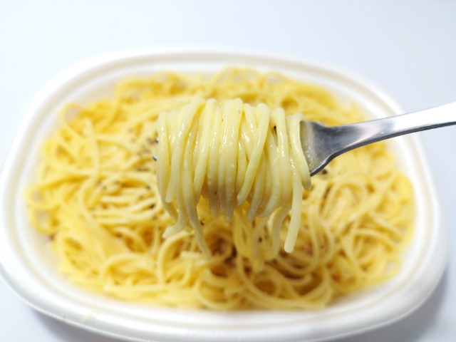 大盛のカルボナーラです。以前の購入が2025年7月30日発売だったので、約5ヶ月近く経っていますが、価格が580円(税込626.40円)から590円(税込637.20円)に商品名がソースたっぷり大盛カルボナーラからなめらかソースの大盛カルボナーラへと変わっています。ちなみに商品名と価格は変わっていますが、前回と栄養成分は全く変わっていないので、実質は値上げだと思います。そんなカルボナーラですが、たまごの味わいとチーズのコク、クリームのなめらかな味わいがあって、間違いのない美味しさです。パスタはほどよい弾力と小麦の風味で、ソースともよく合います。トッピングのベーコンが味や食感のアクセントになっている事で、最後のひと口まで飽きる事なく食べられます。今回はそのまま食べましたが、追い胡椒や卵黄をのせて、味変しながら食べても美味しいと思います。内容量は商品名通りの大盛なので、ガッツリ食べたい方にはちょうど良いと思います。ぜひなめらかソースの大盛カルボナーラを食べてみて下さい。