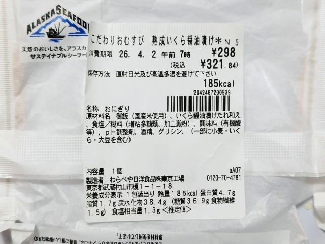 いくら醤油漬けを使ったおむすびです。以前の購入が2025年11月25日発売だったので、約4ヶ月以上経っていますが、価格が285円(税込307.80円)から298円(税込321.84円)に変わっています。そんなおむすびですが、いくら醤油漬けはいくらの旨味とだし醤油の味わいがあって、ご飯が進む一品になっています。また、以前と変わらずいくらの粒に弾力があって、プチっと弾ける食感も楽しめます。ご飯はふっくらとした食感とほのかな甘味があって、安定の美味しさです。大きさは普通のおむすびサイズで、小腹が空いた時や主食にあと一品追加したい時にオススメです。ぜひ熟成いくら醤油漬けのこだわりおむすびを食べてみてください。