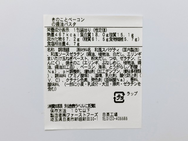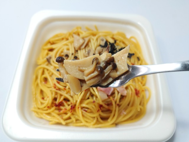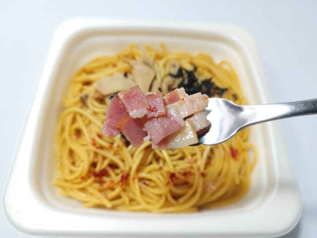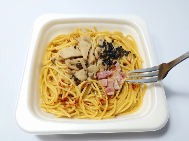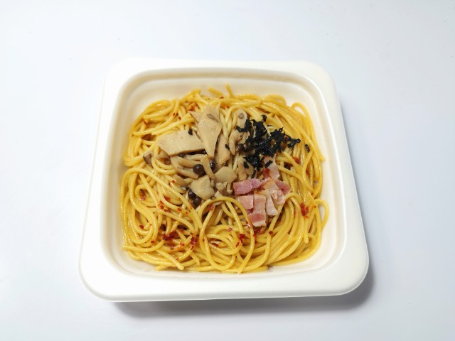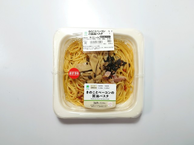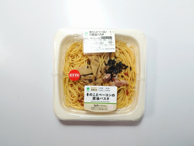 ファミリーマートの今週の新商品「きのことベーコンの醤油パスタ」を食べてみました。