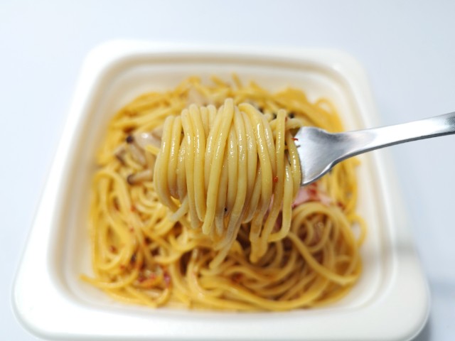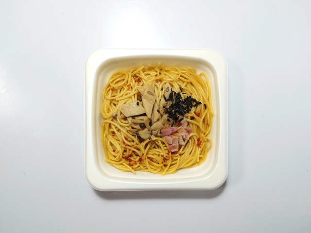 きのこベーコンを使った醤油パスタです。以前の購入が2025年6月24日発売だったので、約8ヶ月近く経っていますが、価格が426円(税込460円)から369円(税込398円)へと変わっています。そんな醤油パスタですが、だしの旨味醤油の味わいがあって、食べ出すと止まらなくなる美味しさです。きのこエリンギぶなしめじが使われていて、きのこの風味シャキシャキとした食感で、パスタともよく合います。ベーコンはそこまで量がありませんが、ほどよい塩味食感のアクセントになっています。他にも海苔輪切り唐辛子などがのっていて、それぞれの味や食感を楽しむ事が出来ます。内容量は1食分にちょうどよく、お腹も満たされます。ぜひきのことベーコンの醤油パスタを食べてみてください。