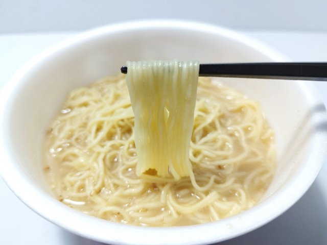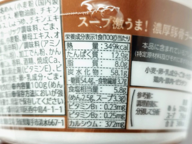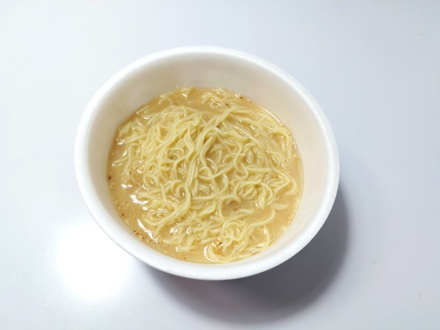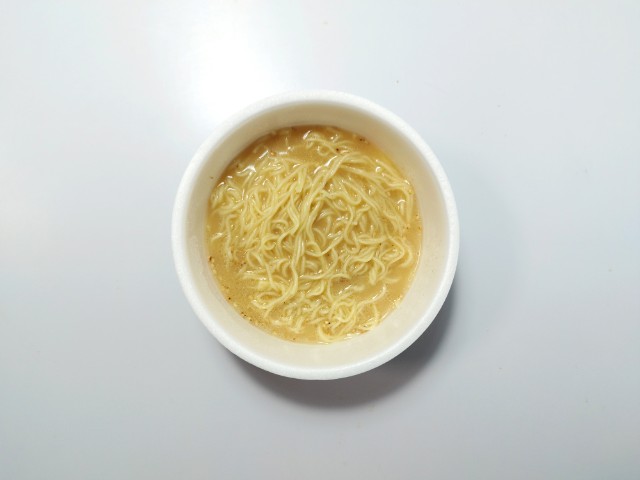 スープが美味しい豚骨ラーメンです。以前の購入が2025年4月15日発売だったので約7ヶ月近く経っていますが、価格は変わっていません。そんな豚骨ラーメンですが、フタを開けると中には液体スープと粉末スープと麺が入っていて、具材はありません。スープ激うまの商品名通り、それだけスープに自信があるという事だと思います。実際に食べてみると豚骨の旨味とごまの味わいがあって、止まらなくなる美味しさです。また、豚骨独特の臭みはほとんどなく、とろみがあって濃厚な味わいなのに後味はスッキリとしています。麺はツルっとした食感の細麺で歯切れも良く、箸がどんどんと進みます。内容量は普通のカップ麺サイズで、小腹が空いた時やおにぎりやパンと合わせて1食分にするのにもオススメです。ぜひスープ激うま!濃厚豚骨ラーメンを食べてみて下さい。