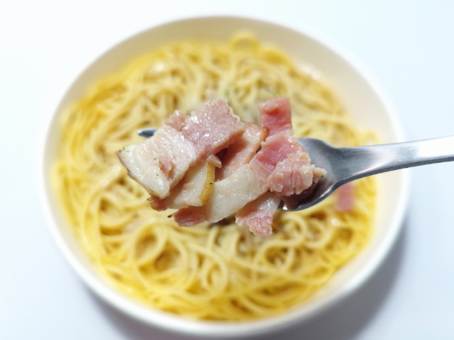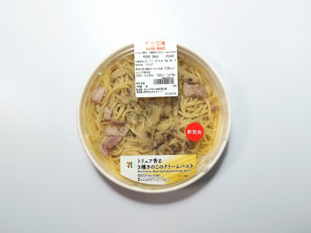 トリュフが香るきのこのクリームパスタです。以前の購入が2025年6月18日発売なので約5ヶ月近く経っていますが、価格が520円(税込561.60円)から550円(税込594円)に商品名がトリュフ香るきのこクリームパスタからトリュフ香る 3種きのこのクリームパスタへと変わっています。そんな3種きのこのクリームパスタですが、ソースはなめらかな味わいとトリュフの香り、ブイヨンの旨味があって、間違いのない美味しさです。以前も同様ですが、トリュフの香りがしっかりと感じられるパスタになっている事で、ワンランク上の味わいを楽しめるような仕様になっています。パスタはほどよい硬さと小麦の風味で、クリームソースとの相性も抜群です。トッピングにはしめじ、舞茸、エリンギといった3種類のきのこにベーコンが使われていて、それぞれの味や食感を楽しめます。内容量は1食分にちょうどよく、お腹も満たされます。ぜひ3種きのこのクリームパスタを食べてみて下さい。