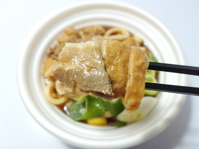 豚肉とねぎ、油揚げがのったうどんです。以前の購入が2024年11月19日発売なので約1年近く経っていますが、価格が598円(税込645.84円)から648円(税込699.84円)に商品名が埼玉県産小麦使用 深谷ねぎの肉汁うどんから埼玉県産小麦使用 武蔵野うどん(肉汁)へと変わっています。そんな武蔵野うどんですが、つゆはだしの旨味と醤油の風味があって、美味しいのひと言です。極太のうどんはごわごわとした食感と小麦の風味があって、食べ応えがあります。甘辛く味付けされた豚肉はしっとり柔らかい肉質とジューシーな脂で、うどんとのバランスが良いです。ねぎはシャキシャキとした食感とねぎの甘味があって、味や食感のアクセントになっています。他にも豚肉同様に甘辛く味付けされた油揚げものっていたりと、最後のひと口まで飽きることなく食べられます。内容量は1食分にちょうどよく、お腹も満たされます。ちなみにセブンイレブンでは現在、東北、茨城県、広島県、岡山県、四国、大分県などで地域限定のフェアを開催していて、この商品もそれらの一つとなっています。今回の商品はかなり地域が限られてしまっていて、購入するのはちょっと厳しいかもしれません。ただ、逆にその地域のセブンイレブンでしか買えない商品はたくさんあって、皆さんの地域にもあると思います。今回の商品もこんな商品を売っているんだ的な感覚で見てもらって、高そうや美味しくなさそうといった見方や、ご自身の地域限定商品の比較などにしてもらえたら嬉しく思います。と言っているのに申し訳ないですが、締めの言葉は必要ですので最後に、ぜひ武蔵野うどんを食べてみて下さい。