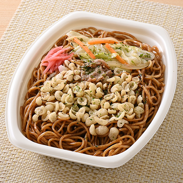 旨みの強さが特徴のオリジナルソースやにんにくなどで炒めたソース焼そばです。具材は揚玉・豚肉・キャベツ・玉ねぎ・人参・紅しょうがです。※関東の一部地域、宮崎県、鹿児島県では取り扱いがございません。