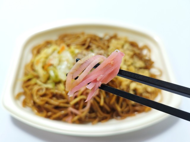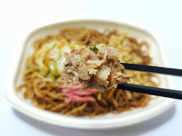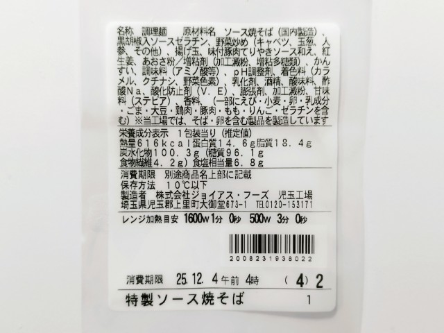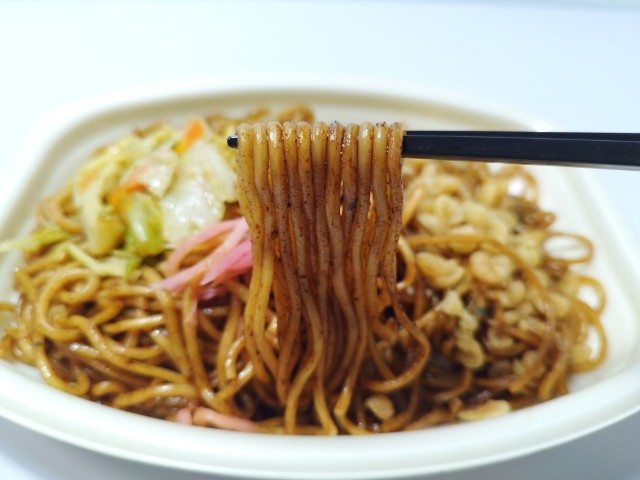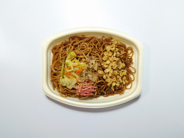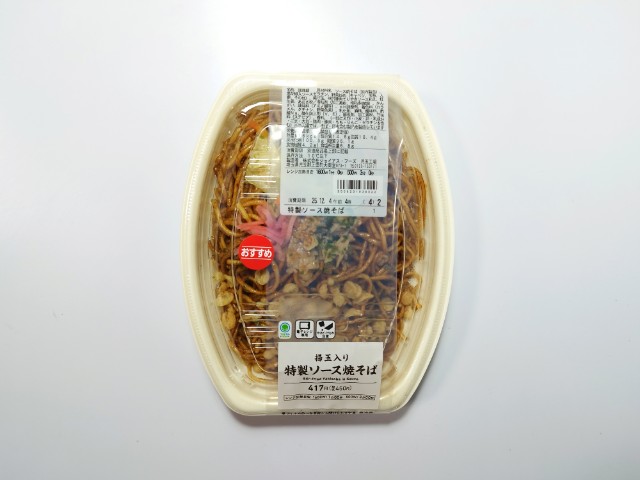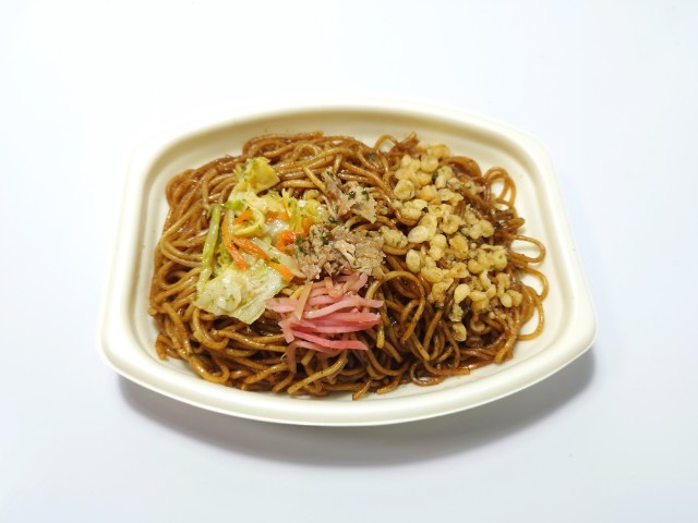 ソース焼そばです。以前の購入が2024年11月19日発売だったので、約1年近く経っていますが、価格が399円(税込430円)から417円(税込450円)に商品名がジューシーソース焼そばから揚玉入り 特製ソース焼そばへと変わっています。コンスタントに販売されている商品なので、店頭で見かけたり、食べた事がある方も多いと思います。今回、新商品ではありますが、正確にはリニューアルというのが正しいのかもしれません。そんな特製ソース焼そばですが、ソースの旨味と黒胡椒の風味で、安定の美味しさです。具材にはキャベツや豚肉、紅しょうが、揚玉などがのっていて、それぞれの味や食感を楽しむ事が出来ます。今回はそのまま食べましたが、マヨネーズやあおさを加えて、味変しながら食べても美味しいと思います。内容量は1食分にちょうどよく、お腹も満たされます。ぜひ特製ソース焼そばを食べてみて下さい。