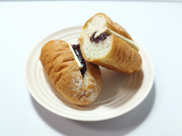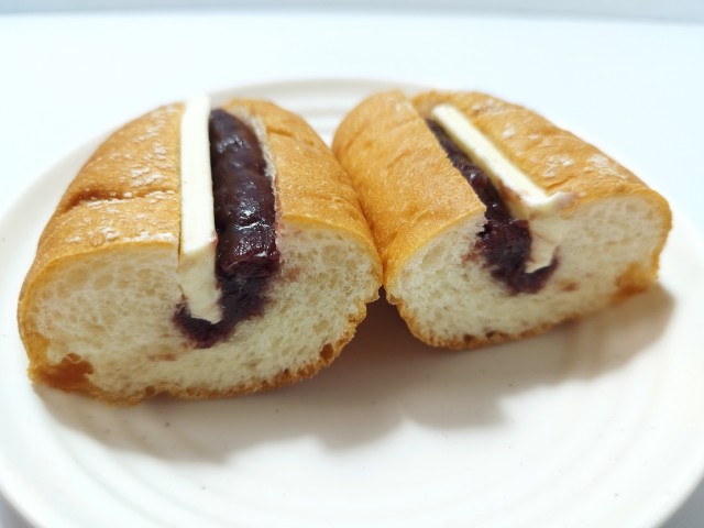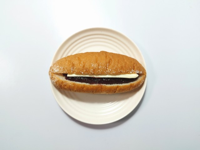 つぶあんとバターを挟んだフランスパンです。以前の購入が2024年12月3日発売だったので、1年以上経っていますが、価格が192円(税込)から203円(税込)へと変わっています。そんなあんバターフランスパンですが、生地はしっかりとした食感と小麦の風味があって、食べ応えがあります。つぶあんはやさしい甘味と小豆の味わい、バターはなめからな味わいとほのかな塩味で、相性抜群の組み合わせになっています。甘さがしつこくないので、最後のひと口まで飽きることなく食べられます。また、今回はそのまま食べましたが、軽く温めて食べても美味しいと思います。大きさは普通の菓子パンサイズで、おやつや小腹が空いた時にピッタリです。ぜひあんバターフランスパンを食べてみてください。