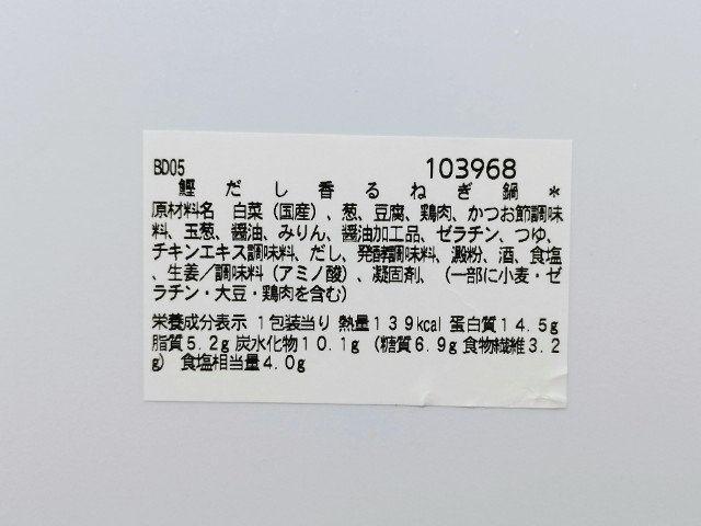鰹だし香るねぎ鍋です。以前の購入が2024年12月12日発売だったので、約1年近く経っていますが、価格が458円(税込494.64円)から498円(税込537.84円)に商品名がねぎ鍋から鰹だし香るねぎ鍋へと変わっています。実際に食べてみると、スープは鶏の旨味と鰹だしの風味があって、やさしい塩味ながら味わい深いスープになっています。具材にはねぎを始め、豆腐や白菜、鶏団子など色々と入っていて、それぞれの味や食感を楽しめます。ポイントはやはりカロリーで、しっかりと食べ応えがあって、1食あたり139kcalはかなり嬉しいと思います。今回はこのまま食べましたが、残ったスープにご飯を入れて、雑炊風にしても美味しいと思います。内容量は一人分にちょうどよく、おつまみや小腹が空いた時にピッタリです。ぜひ鰹だし香るねぎ鍋を食べてみて下さい。