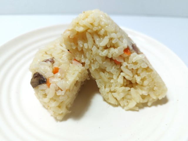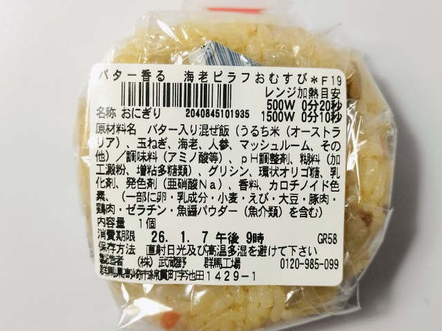 海老ピラフおむすびです。以前の購入が2025年12月9日発売だったので、約1ヶ月近く経っていますが、価格は変わっていません。今回は販売地域の変更にて再販されたといった感じで、今後も同様に色々な地域で発売されるのかもしれません。そんな海老ピラフおむすびですが、ブイヨンの旨味海老の風味バターの香りがあって、美味しいのひと言です。ご飯には海老マッシュルーム玉ねぎ人参ベーコンなどが混ぜ込まれていて、最後のひと口まで飽きることなく食べられます。また、パッケージの温めておいしいの言葉通り、温める事でご飯のパラパラ加減バターの香りがアップするので、余裕があれば温めて食べる事をオススメします。大きさは普通のおむすびサイズで、小腹が空いた時主食にあと一品追加したい時にピッタリです。ぜひ海老ピラフおむすびを食べてみてください。