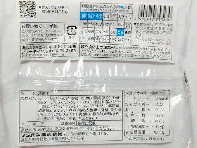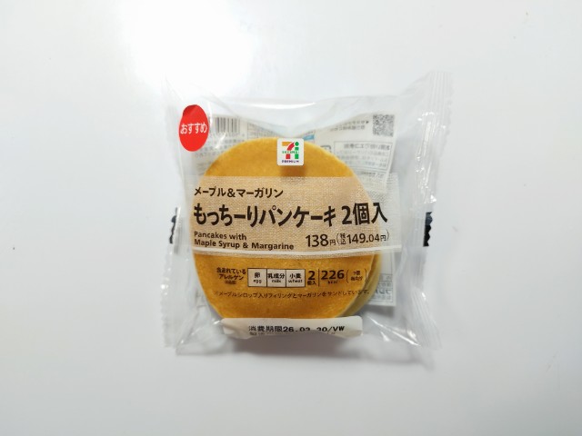 メープルマーガリンを挟んだパンケーキです。以前の購入が2025年4月15日発売だったので、約11ヶ月近く経っていますが、価格は変わっていません。ほぼ通年販売の商品なので、店頭で見かけたり、食べたことがある方も多いと思います。今回、新商品ではありますが、正確にはリニューアルというのが正しいのかもしれません。そんなパンケーキですが、生地もちっとした食感ほのかな甘みがあって、これだけでも美味しく食べ進められます。メープルなめらかな食感ほどよい甘みマーガリンとろける食感ほんのりとした塩味があって、甘じょっぱい味わいを楽しむことができます。2個入ですが、1個手のひらサイズくらいなので、一人でも普通に食べ切れます。ぜひもっちーりパンケーキを食べてみてください。