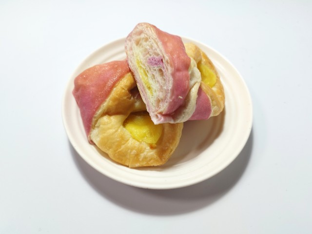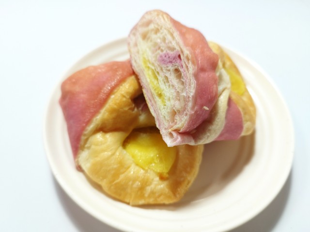 紫芋パウダーを練り込んだ生地とデニッシュ生地をはり合わせ、埼玉県産富の川越いものあんを包み込んだクロワッサンです。※茨城県・栃木県・群馬県・山梨県・長野県・静岡県(東部)では取り扱いございません。