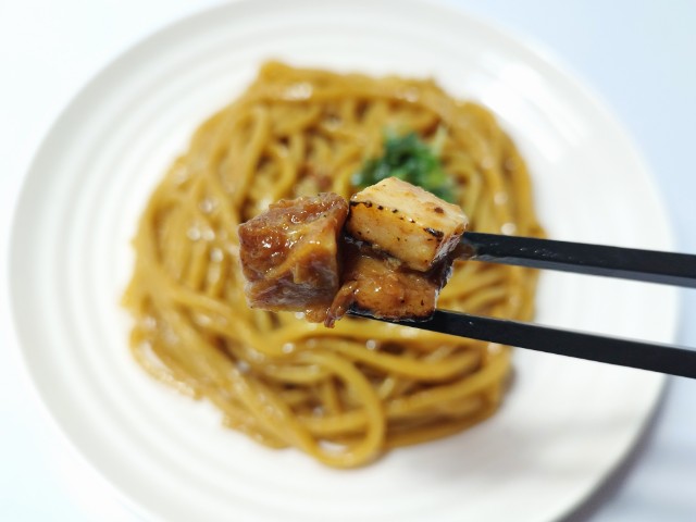 弾力ある極太麺と濃厚ダレ。お好みで別添のにんにく酢をかけて。