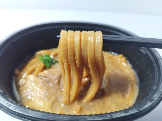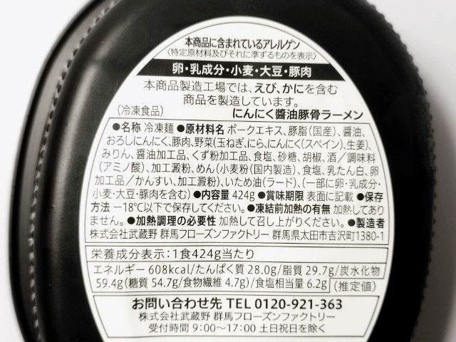 冷凍食品のにんにく醤油豚骨ラーメンです。以前の購入が2025年1月28日発売だったので、約1年近く経っていますが、価格は変わっていません。容器がそのまま器の代わりになっている冷凍食品のラーメンで、電子レンジで500W7分40秒ほど温めると完成します。そんなにんにく醤油豚骨ラーメンですが、スープは豚の旨味と醤油の風味、にんにくの味わいがあって、濃厚な醤油豚骨スープになっています。太麺はワシワシ食感と小麦の風味で食べ応え抜群です。具材には焼豚やにら、玉ねぎなどが入っていて、それぞれの味や食感を楽しめます。価格や長期保存が出来るといった部分を考えると、かなりコスパがよい商品だと思います。内容量は1食分にちょうどよく、お腹も満たされます。ぜひにんにく醤油豚骨ラーメンを食べてみてください。
