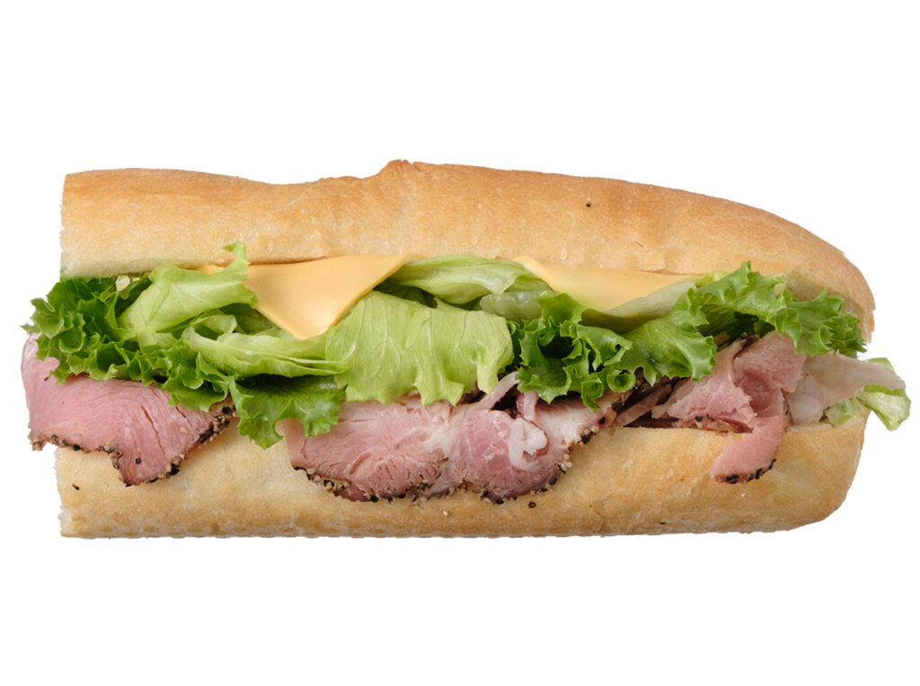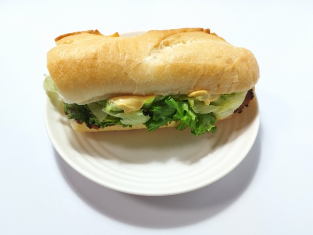 レタスとペッパーポーク、チェダーチーズを挟み、クリームチーズを使用したマスタードマヨネーズを組み合わせたサンドイッチです。