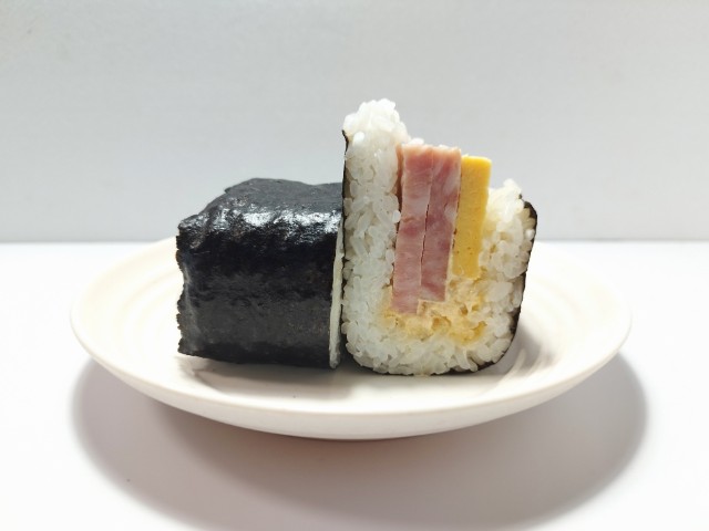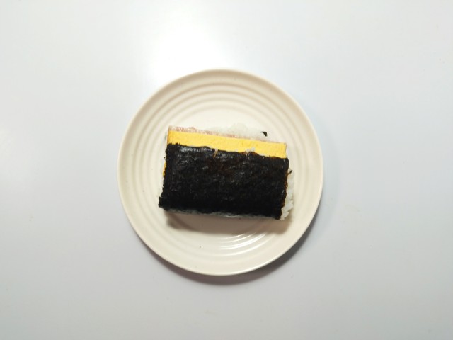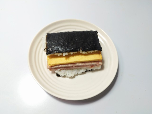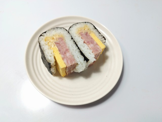 ポークランチョンと玉子焼き、シーチキンマヨネーズが挟まっています。