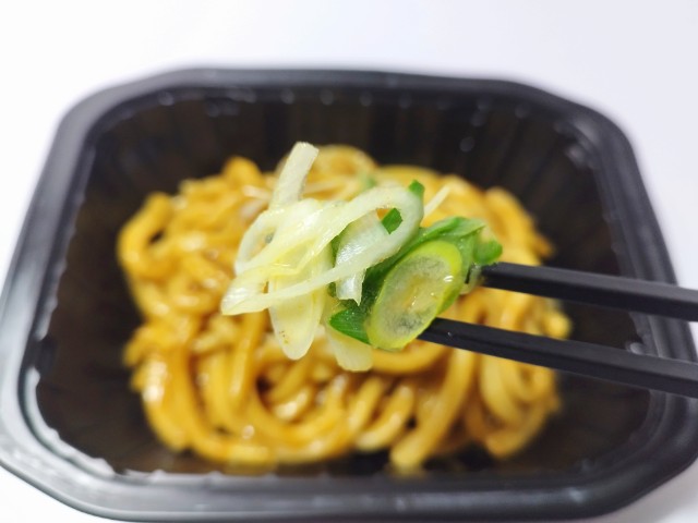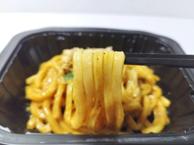 大盛の汁なしカレーうどんです。以前の購入が2025年7月15日発売だったので、約7ヶ月近く経っていますが、価格は変わっていません。そんな汁なしカレーうどんですが、カレーはだしの旨味とスパイスの風味があって、全体的には和風ベースのカレーになっています。うどんはもちもちとした食感と小麦の風味で、カレーとの相性抜群です。具材には豚肉とねぎがのっていて、それぞれの味や食感を楽しめます。ピリッとした辛味はあるものの、やさしい味わいのカレーとなっているので、辛味が苦手な方でも普通に食べられると思います。内容量は大盛ですが、普通に比べてちょっと多いくらいで1食分にちょうどよいです。ぜひ大盛の汁なしカレーうどんを食べてみてください。