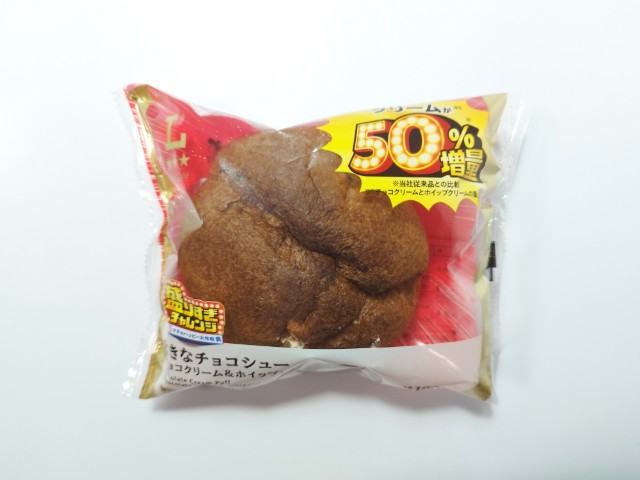 盛りすぎ!大きなチョコシューです。以前の購入が2025年6月9日発売だったので、約5ヶ月以上経っていますが、価格が181円(税込)から194円(税込)に変わっています。また、今回価格が違うのは、従来品の大きなチョコシュー(チョコクリーム&ホイップ)(2025年11月4日発売)の再販にて値上げされている為、それが今回そのまま反映された形になっています。今年6月に開催されたローソン50周年記念「盛りすぎチャレンジ」が好評だった事を受けて、11月18日から「盛りすぎチャレンジ」感謝の追加開催が実施されていて、今回の商品もその対象商品の一つになっています。ちなみに内容としてはクリームが今だけ50%増量(従来品との比較)になっているらしいです。そんな大きなチョコシューですが、シュー生地はしっとりとした食感と歯切れの良さで、安定の美味しさです。中のチョコクリームはミルクチョコの風味となめらかな食感、ホイップクリームはミルクのコクとやさしい甘味で、シュー生地とのバランスも良いです。今回はクリーム増量で、さらに食べ応えがあります。大きさは一人分にちょうどよく、おやつや食後のデザートにオススメです。ぜひ盛りすぎ!大きなチョコシューを食べてみて下さい。