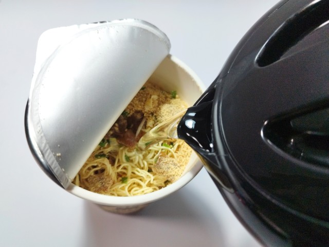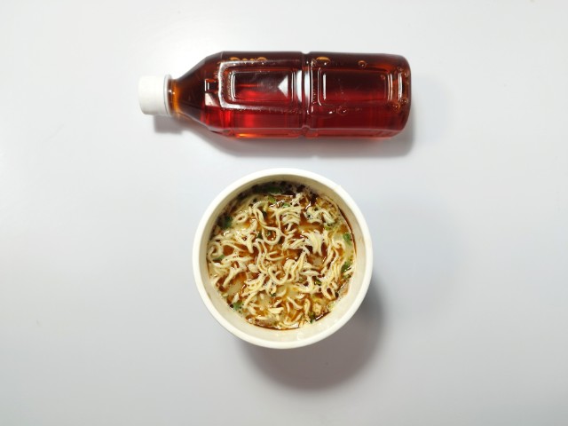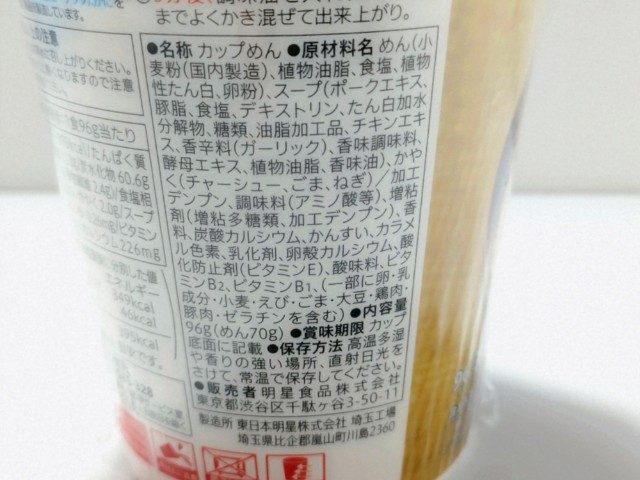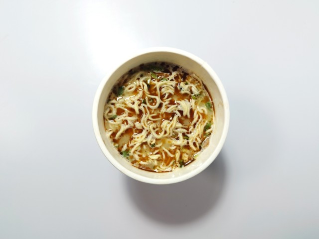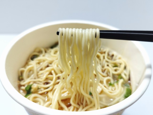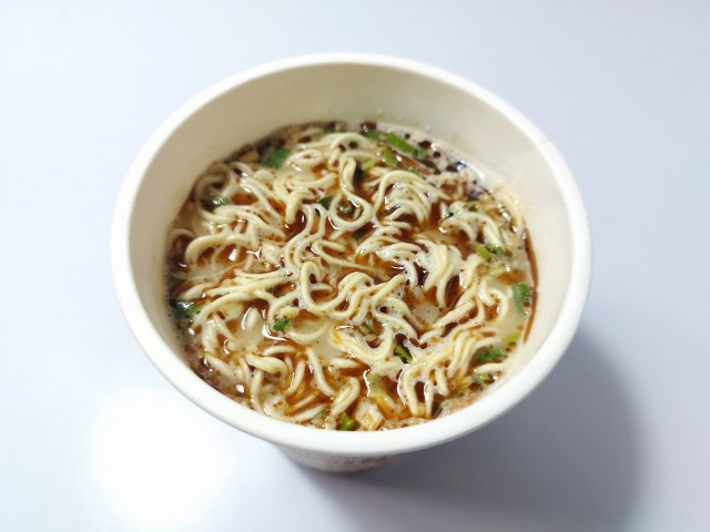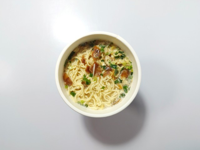 黒マー油豚骨ラーメンです。以前の購入が2025年2月18日発売なので約8ヶ月近く経っていますが、価格は変わっていません。黒マー油豚骨ラーメンですが、スープは豚の旨味と焦がしにんにくの風味、濃厚な味わいながらも、すっきりとした後味になっています。細めの麺はプツッとした食感と歯切れの良さで、豚骨スープともよく合います。具材にはチャーシュー、ごま、ねぎが使われていて、それぞれの味や食感を楽しめます。内容量は普通のカップ麺サイズで、小腹が空いた時やおにぎりやパンと合わせて1食分にするのにもオススメです。ぜひ黒マー油豚骨ラーメンを食べてみて下さい。