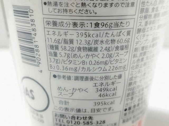 熱量:395kcal、たんぱく質:11.6g、脂質:12.3g、炭水化物:60.6g(糖質:58.2g、食物繊維:2.4g)、食塩相当量:5.7g
