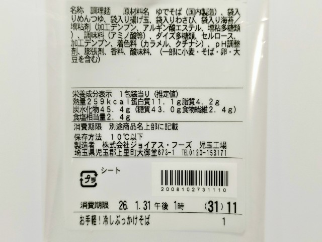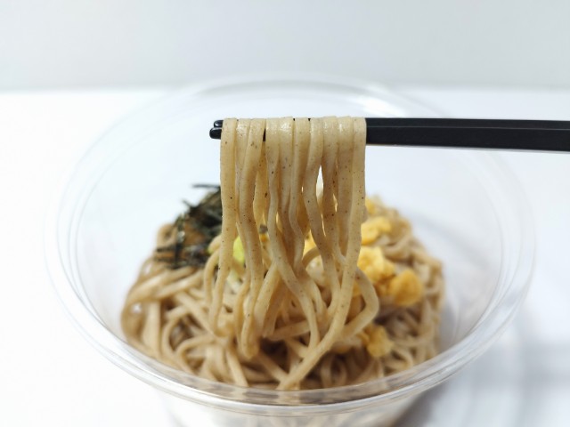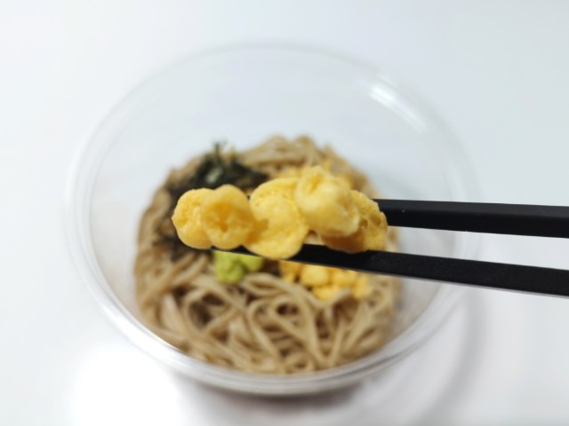 小容量のぶっかけそばです。以前の購入が2025年9月16日発売だったので、約4ヶ月以上経っていますが、価格が276円(税込298円)から298円(税込321円)へと変わっています。そんなぶっかけそばですが、そばはそばの風味と歯切れの良さで、安定の美味しさです。つゆはだしの旨味と醤油の風味があって、そばとのバランスも良いです。具材として揚げ玉、刻みのり、わさびが付いていて、今回は全部のせてしまいましたが、味変として少しずつ合わせながら食べるのも美味しいと思います。小容量なので小腹が空いた時やおにぎりやパンと合わせて1食分にするのにもオススメです。ぜひお手軽!冷しぶっかけそばを食べてみてください。