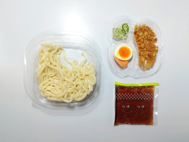 つゆでうどんをほぐして、具材をのせたら完成です。