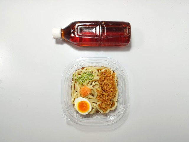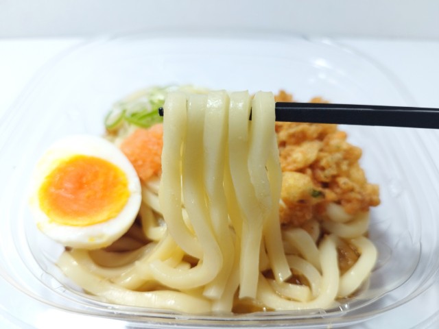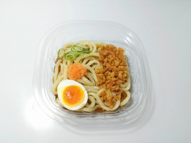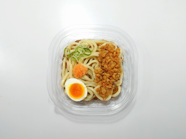 自家製揚げ玉を使った冷たいうどんです。以前の購入が2025年8月26日発売だったので、約5ヶ月以上経っていますが、価格は変わっていません。そんな冷したぬきうどんですが、つゆはだしの旨味と醤油の風味で、間違いのない美味しさです。うどんはもちもちとした食感と小麦の風味があって、つゆとのバランスも良いです。一番のポイントはやはり自家製の揚げ玉で、サクサクとした食感と海老の風味があって、うどんだけでなく、ご飯にのせてもいけるくらいに美味しいです。他にもゆで玉子や紅葉おろしもあるので、最後のひと口まで美味しく食べられます。内容量は1食分にちょうどよく、お腹も満たされます。ぜひ自家製揚げ玉の冷したぬきうどんを食べてみてください。