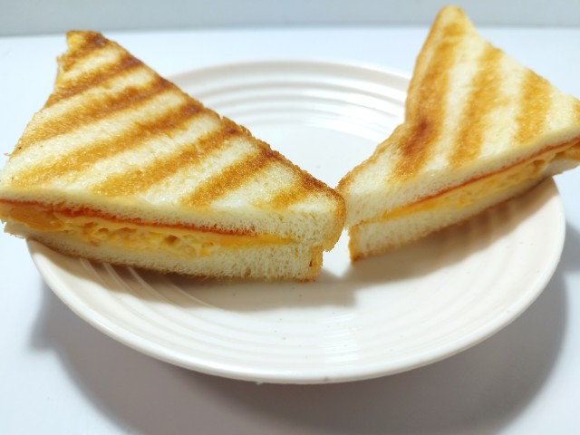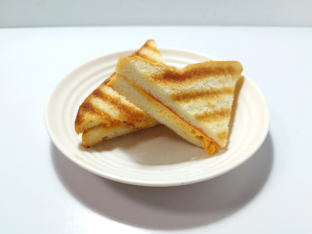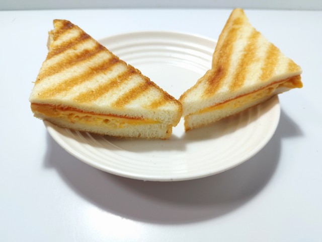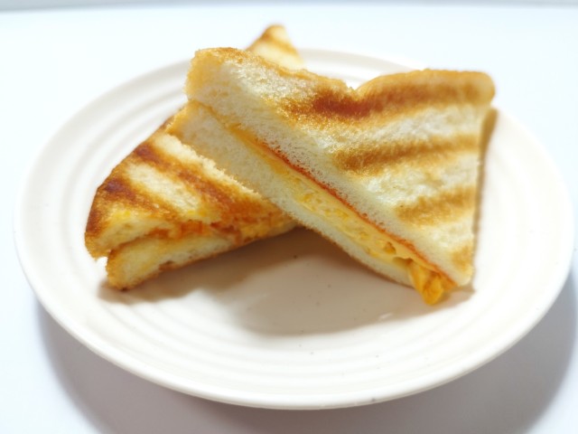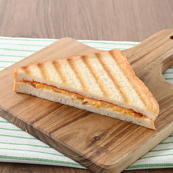 ベーコン入りのスクランブルエッグとチーズ、トマトソースをサンドし、ハーフカットして焼き上げたホットサンドです。