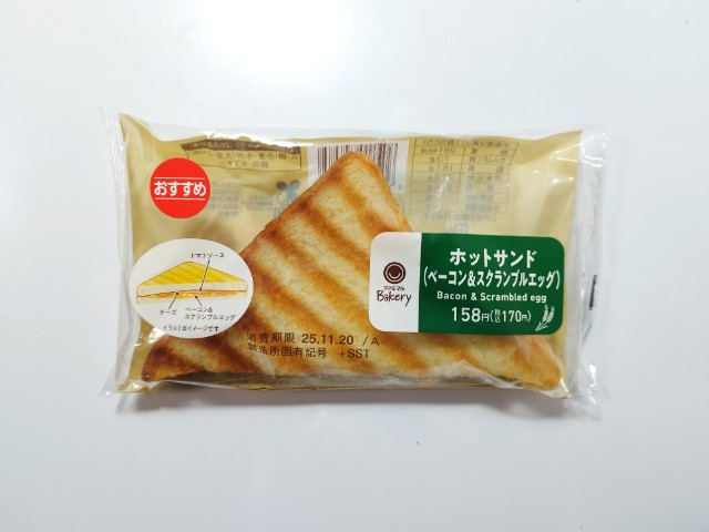 ベーコンとスクランブルエッグを挟んだホットサンドです。以前の購入が2024年10月15日発売なので1年以上経っていますが、価格が156円(税込168円)から158円(税込170円)へと変わっています。そんなホットサンドですが、具材にはベーコン入りスクランブルエッグとチーズが使われていて、ベーコン入りスクランブルエッグはベーコンの塩味とたまごの甘味があって、間違いのない美味しさです。一緒に入っているチーズはチーズの風味とほのかな塩味で、ベーコン入りスクランブルエッグとも相性抜群です。ポイントは一緒に挟まっているトマトソースで、ほどよい酸味とトマトの風味で、具材の美味しさをさらに引き立てています。大きさは食パン1枚分なので、朝食や小腹が空いた時にピッタリです。ぜひベーコン&スクランブルエッグのぜひホットサンドを食べてみてください。