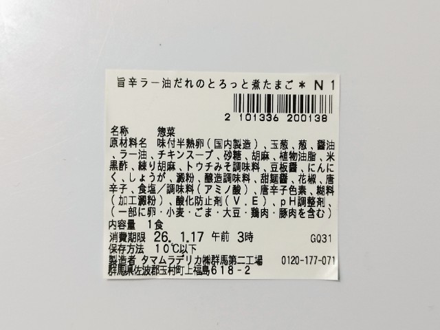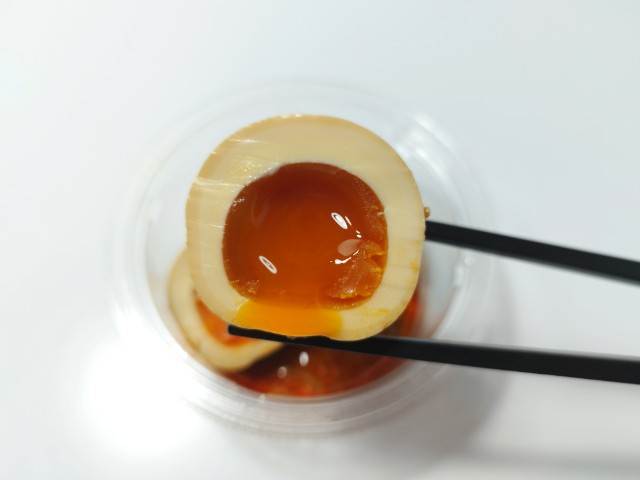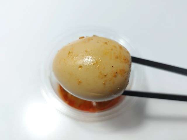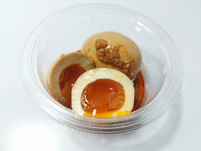 ラー油だれ味付けされた煮たまごです。以前の購入が2025年7月29日発売だったので、約半年近く経っていますが、価格は変わっていません。そんな煮たまごですが、とろりとした黄身の味わいとプルンとした白身の食感を楽しめます。ラー油だれは醤の旨味と花椒の風味、ラー油の辛味があって、煮たまごとも相性抜群です。今回はそのまま食べましたが、ご飯にのせてたまごを崩して食べても、また美味しいと思います。内容量は一人分にちょうどよく、おつまみやおかずのあと一品追加にもオススメです。ぜひ旨辛ラー油だれのとろっと煮たまごを食べてみてください。