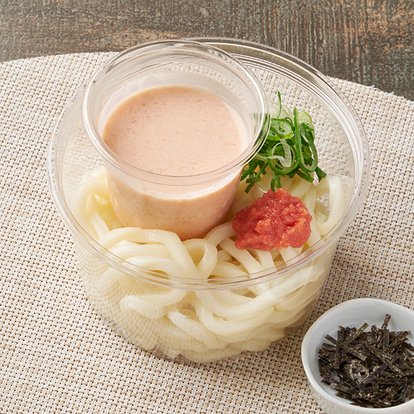 手に取りやすいサイズの冷しうどんです。コシのあるうどんに、だしのきいた明太クリームソースを合わせ、具材として明太子・青ねぎをのせました。別添の刻み海苔がよく合う仕立てです。