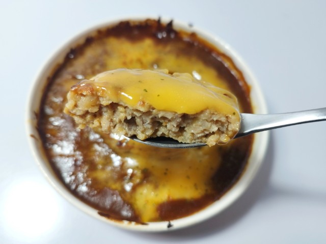 チーズとハンバーグがのった焼きカレードリアです。以前の購入が2025年11月12日発売だったので、約3ヶ月近く経っていますが、価格は変わっていません。そんな焼きカレードリアですが、カレーソースは肉の旨味は野菜の甘味、チーズソースはなめらかな食感とチーズの塩味、ハンバーグは柔らかい肉質とジューシーな味わいがあって、単品はもちろん、どれと合わせても美味しくなる組み合わせになっています。ご飯はターメリックライスになっていて、カレーソースとのバランスが良いです。スパイスの風味はしっかりとありますが、辛味はそこまでないので、辛いのがちょっと苦手な方にも食べやすいと思います。出来立ては激熱なので注意が必要ですが、熱いうちに食べるのがオススメです。ぜひハンバーグ焼きカレードリアを食べてみてください。