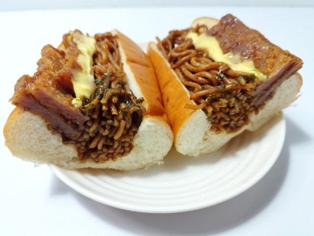 ハムカツと焼きそばが挟まっています!!