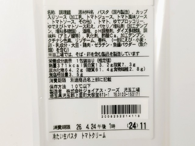 海老とトマトクリームの冷たい生パスタです。以前の購入が2025年4月22日発売だったので、約1年近く経っていますが、価格は変わっていません。そんな冷たい生パスタですが、トマトクリームソースはトマトの酸味とクリームのなめらかな味わいがあって、太めの生パスタともよく合います。パスタはもちもちとした食感と小麦の風味で、クセになる美味しさです。トッピングには海老、トマト、ブロッコリー、パセリが使われていて、見た目はもちろん味や食感も楽しめるので、最後のひと口まで美味しく食べられます。内容量は1食分にちょうどよく、お腹も満たされます。ぜひ海老とトマトクリームの冷たい生パスタを食べてみてください。