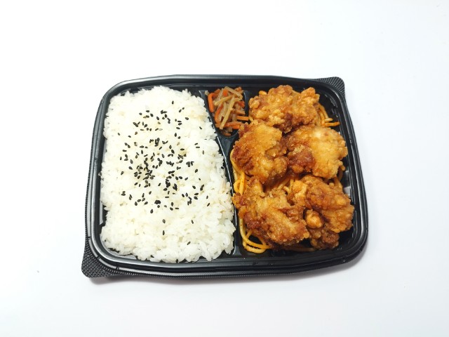 原材料高騰の為、商品価格を変更しております。二段熟成醤油、にんにく、生姜などで作った醤油だれに漬け込んだ唐揚げを5個盛り付けたお弁当です。